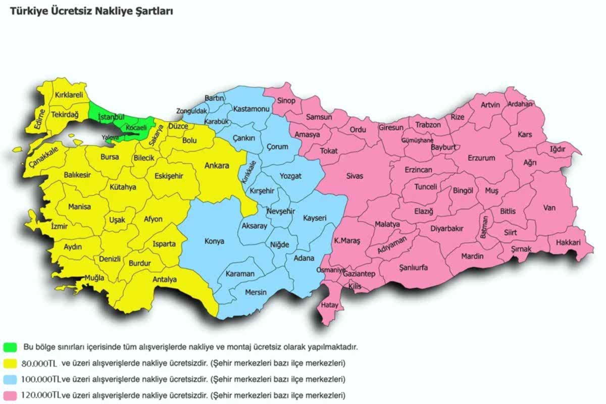 | Pembe Bölge | Pembe bölgede şehir merkezlerine 120.000 TL ve üzeri alışverişlerde nakliye ücretsizdir. |